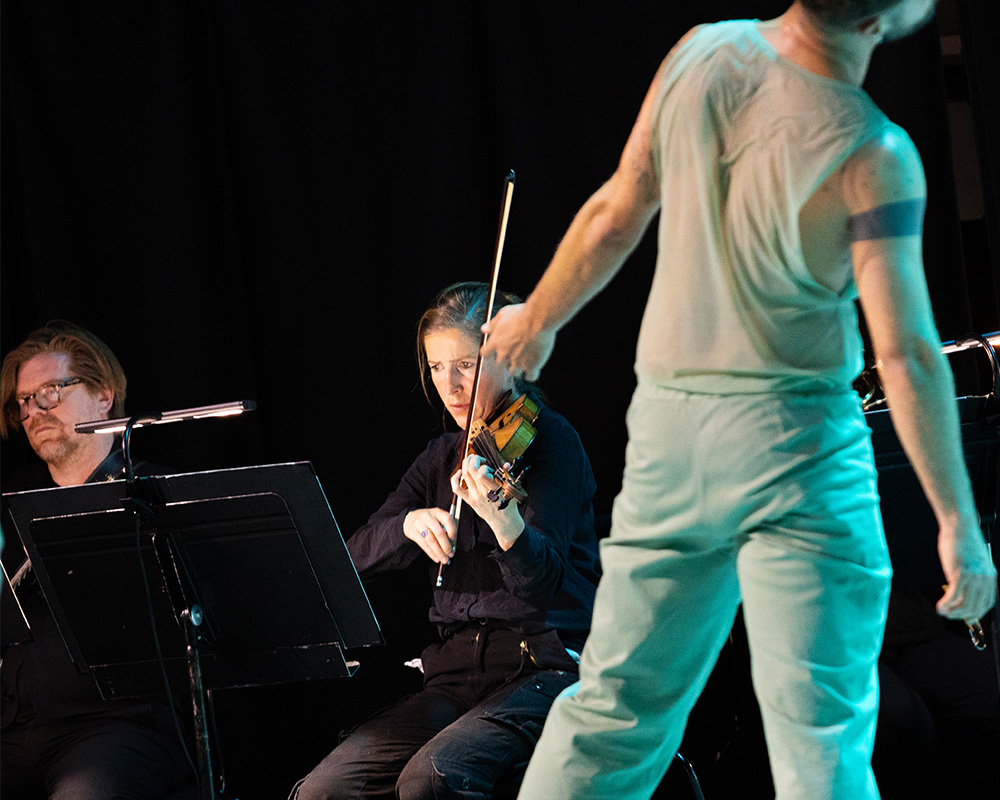 Whilst the piece is written for an unspecified number of players, the London Sinfonietta musicians were 12 on stage, embracing their inner dancer they started their performance with the Sasha Waltz company moving intentionally around the stage barefoot and under the cover of darkness silhouetted by a red back drop before taking their seats to begin playing.